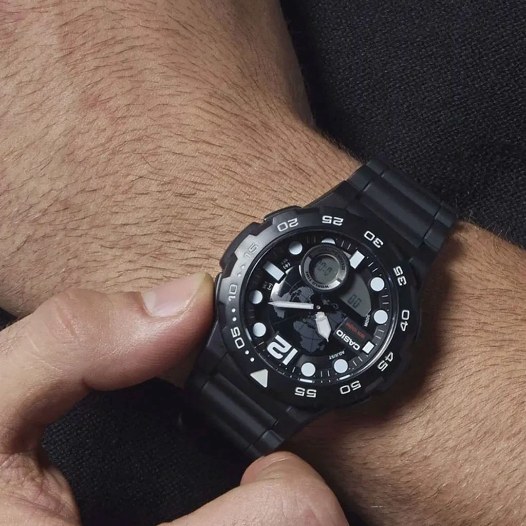 دستهبندی: ساعت جنرال کاسیو10 سال باطری: ضد آب ۱۰۰ مترآلارم روزانه،کرنومتر،تایمر: ساعت جهانیمقاوم برابر ضربه: قاب و بند رزین